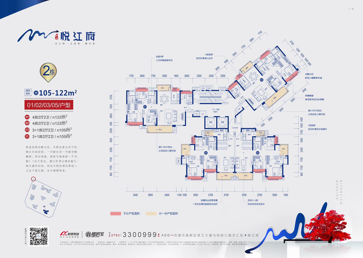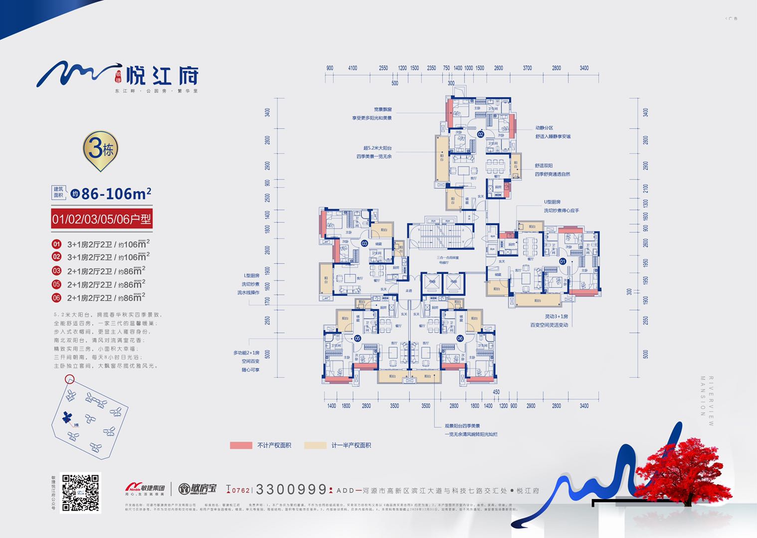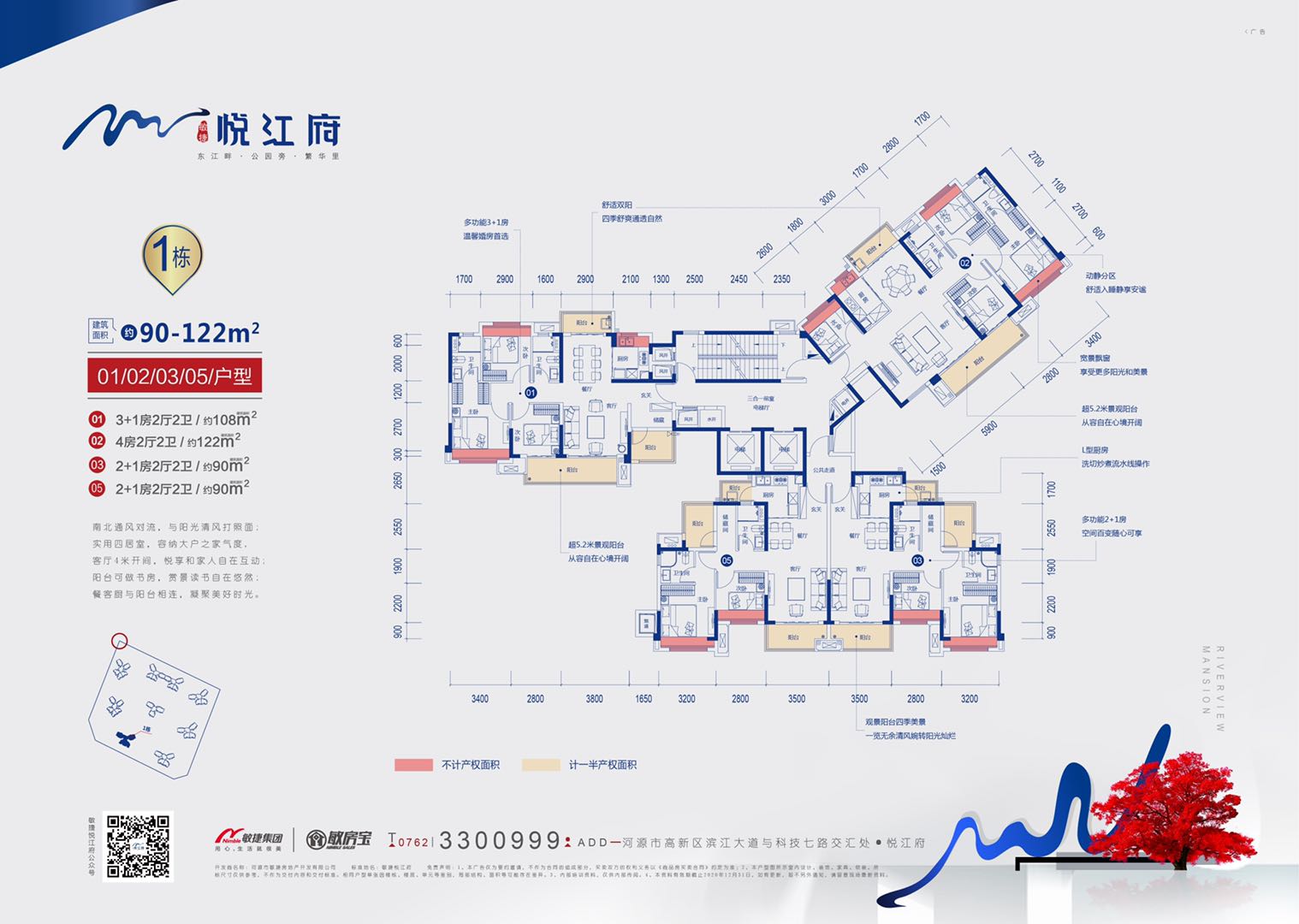 【悦·资源】东江前排,一线江景尽在眼底 项目位于东江旁,拥有名副其实的一线江景资源,足不出户即能欣赏波澜壮阔的绮丽江景,令居者心胸开阔,境界自然非凡。 【悦·教育】双学府圈,优质教育近人一步 项目附近700m处即为南开实验学校,并隶属南开实验学校、高新区实验学校双学区范围内,孩子上学更享天时地利;5KM范围内含河源技师学院雅达分校、东园实验学校、河源市现代职业学院等学校,周边教育资源丰富。 【悦·景观】揽双公园,家门口的娱乐休闲 毗邻项目的滨江公园(建设中),将规划配套服务、康体健身、儿童游乐等设施,满足市民休闲、度假、观光、游览的需求。且临近东洲坝生态湿地公园,生态景观优美怡人,是宜居宜游的上佳之选。 【悦·服务】一级物管,专属智能尊享体验 采用国家一级物业敏捷新生活物业,社区配备智能云监控、智能终端呼梯、智能停车感应、WiFi覆盖等优越服务,出入社区每一步都能享受十足的便利,在保障安全、舒适、便捷的。 【悦·产品】全能户型,匠筑智能江畔美居 项目打造87-138㎡三至五房全功能户型,结合业主家庭结构与居住需求,人性化打造N+1灵动空间,创新设计智能化家居,提升生活体验和人居品质。 【悦·智能】 1. 配备物联网智能门锁,具有指纹、密码、刷卡、手机开锁和机械钥匙五种开锁方式,只需要您的一个指纹就可以开锁,非常方便, 当家人回到家打开物联网门锁时,到家信息会立刻推送到您手机上。 2.情景控制面板,可不同的情景模式,一键控制多个设备,比如离家时可以一键断掉屋内的照明、空调、电视等设备,无需反复检查和繁琐的操作,只需一键,简单方便。 3. 客餐厅我们配置了智能语音音箱,只需要通过一个语音指令就可以执行您想要的场景,您也可以根据您的习惯在手机端或者情景面板控制端一键点击,启动不同模式,让您尽情享智慧科技带来的便利。 4. 客厅窗帘的位置进行了隐蔽式的设计,同时安装了智能窗帘电机,您手动开启窗帘时,只需要轻轻一个力窗帘就会自己开启,或者您可以利用语音音箱操作,您也可以通过触发我们的窗帘控制面板进行控制。 5. 我们还配置了水浸报警器、燃气报警系统、紧急按钮,一旦出现紧急情况,会及时通知给您,智能化系统会将报警信息及时通知至您手机,保障家庭安全。